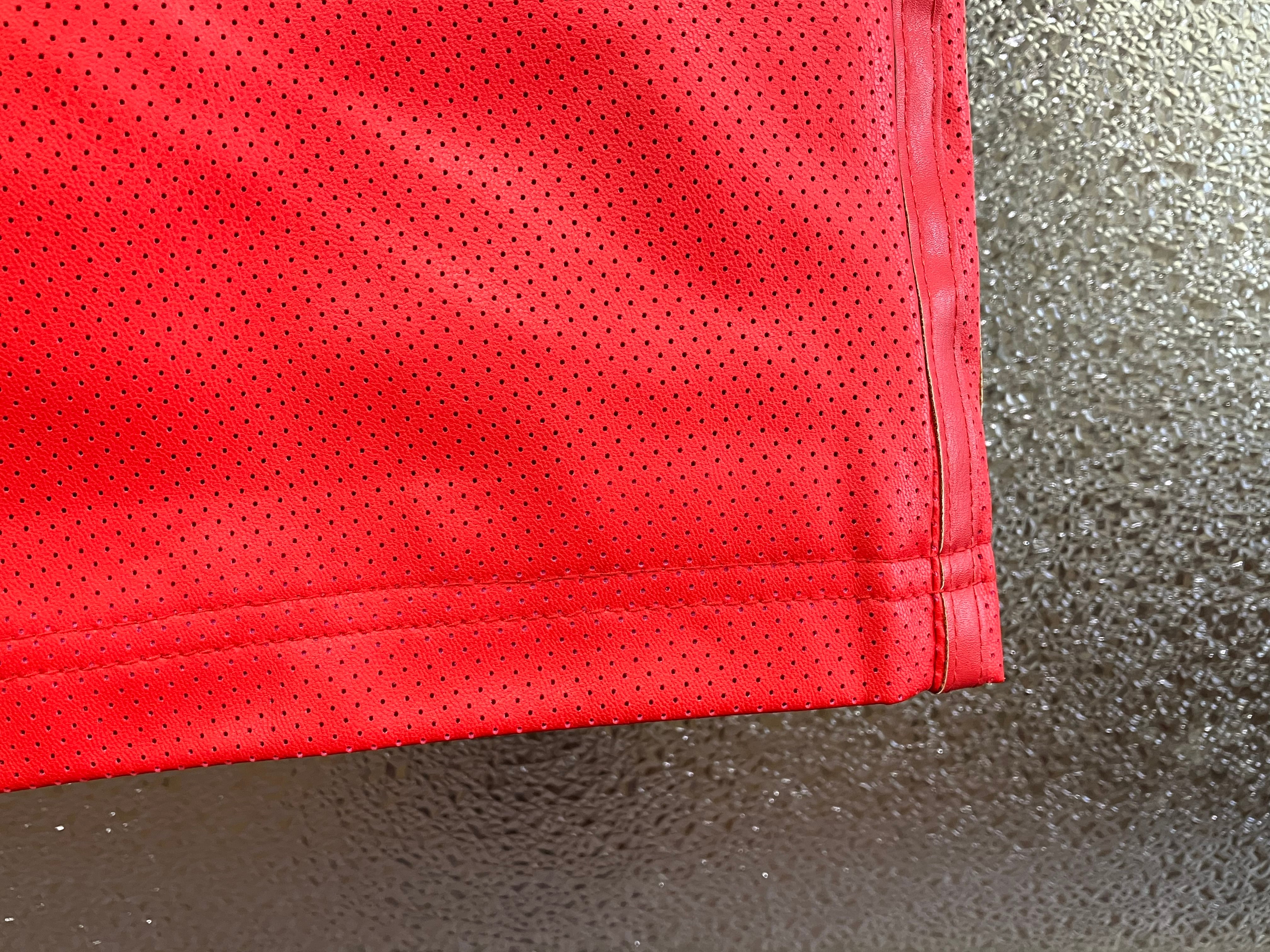 パンチング加工が施された真っ赤な、ストレートシルエットのパンツ!